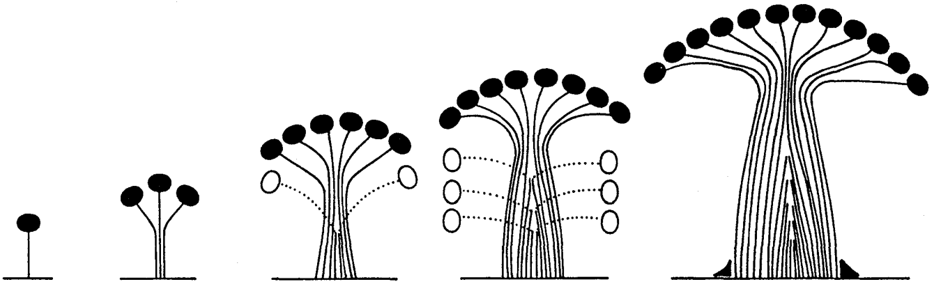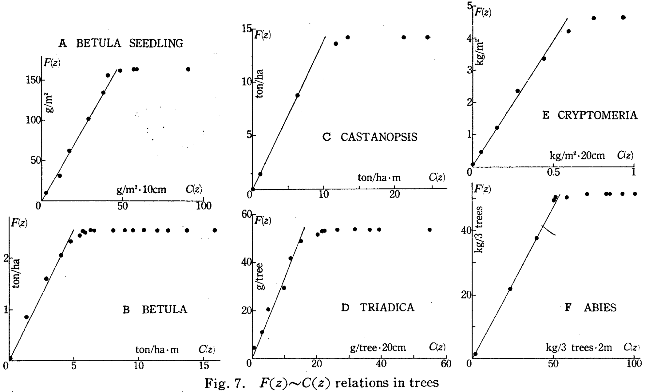 Fig.7で、$C$に対して$F$が比例関係になっていない領域があるが、これは、古い葉が枯れ落ち、古いパイプが封入される幹の根元付近では、それより先についている葉量$F$が一定でも、幹の断面積$C$が小さくなっている部分があることによる。(枯れ落ちた葉は白丸で表され、生きている葉は黒丸で表されている。)