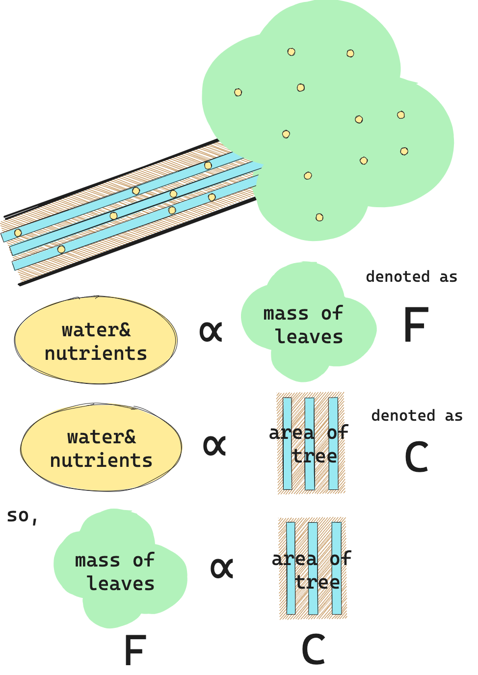 もし、全ての葉が等しいとすれば、葉が必要とする水量と葉が生産する栄養分量は、葉の量に比例する。 そして、幹・枝が通せる水量・栄養分量も、枝の断面積に比例する。 それゆえ、枝の断面積$C$と葉量$F$は比例関係にある。